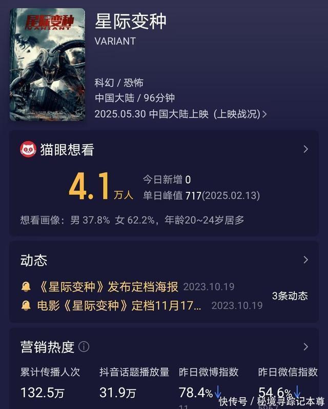 《星际变种》于本年5月30日讲求在内地影院上映,共两东谈主不雅影,累计票房40元东谈主民币。 这部国产科幻恐怖片《星际变种》,先后曾阅历了四次定档和三次撤档,最终细目于本年的5月30日讲求上映,不外不巧的是此次它遇上了汤姆克鲁斯的好莱坞大片《碟中谍8》。 在大部分时分,但凡屡次阅历过屡次定档和撤档的电影,基本皆是质料不外关,对我方莫得信心,讲求上映后的票房发扬也远不尽东谈倡导,以至不错说尽头惨淡,《星际变种》亦然不异。