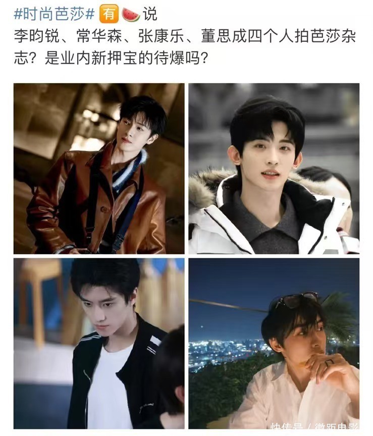 网传,李昀锐、常华森、张康乐、董想成一王人拍了前卫芭莎,这即是业内相比看好的待爆小生。就目下的情况来看,四东说念主最近的热度都是有的,也都有出圈的变装,即是不知说念能不大致保得住热度,有更好的作品出现了。