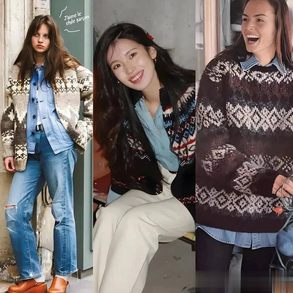 深棕色费尔岛斑纹毛衣的内部叠穿蓝色的牛仔衬衫,显白减龄又彰显出了即兴慵懒的气质,御寒又起范儿。