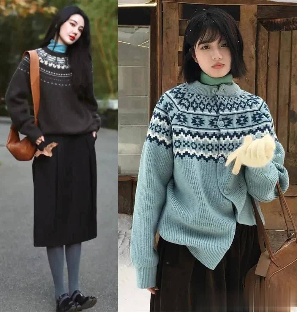 而肤色偏暗的女生,可以选棕色图案的费尔岛毛衣来穿,显白放浪很可以。