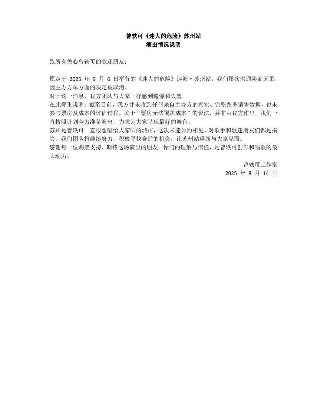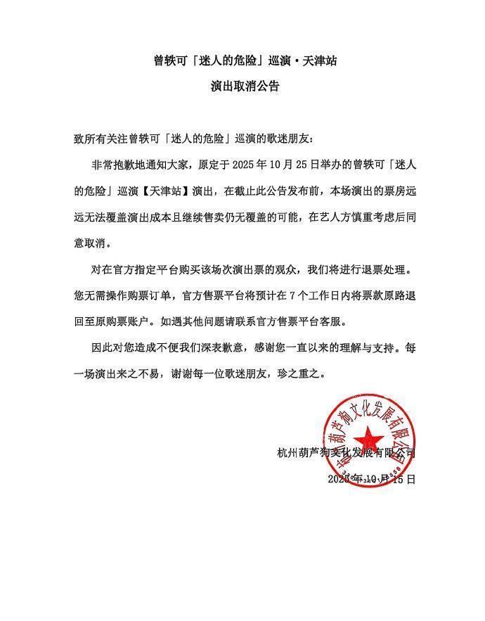10月15日,该官方账号曾发布天津站献技取消公告:相称对不起地示知公共,原定于2025年10月25日举办的曾轶可《迷东谈主的危急》巡演天津站献技,在达成此公揭发布前,本场献技的票房远远无法隐敝献技资本且延续售卖仍无隐敝的可能,在艺东谈主方把稳辩论后原意取消。