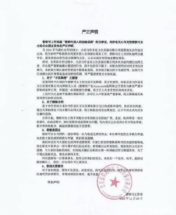 声明默示:11月25日,曾铁可方发布声明称,自2024年与北京手脚音乐文化发展有限公司矍铄合营公约后,曾轶可及团队恒久按约完成献技酌量,但对方屡次未奉行合同义务,包括未按期支付用度、临时变更酌量历程、持造子虚信息等,已严重辞谢献技鼓动并毁伤其正当权益。
