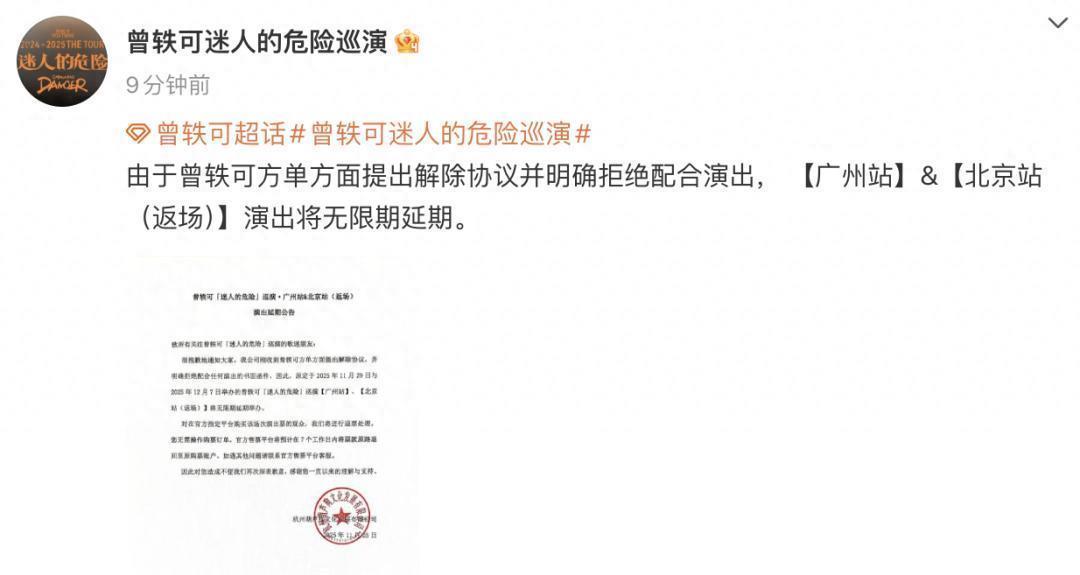 公告表示:“很对不起地示知公共,我公司刚收到曾轶可方片面提议撤废公约,并明确阻隔配合任何献技的书面函件,因此,原定于2025年11月29日与2025年12月7日举办的曾轶可‘迷东谈主的危急’巡演广州站、北京站(返场)将无尽期展期举办。
