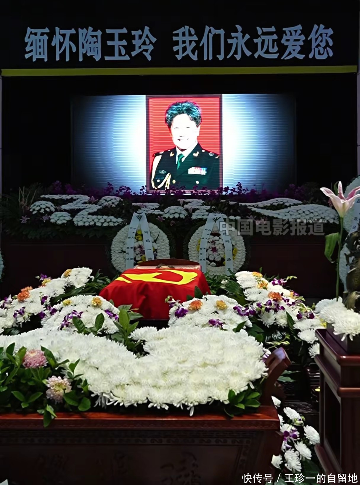 在灵堂的正前哨的最中间不错看到陶玉玲的遗像。遗像的选拔很谨慎,并不是一张平凡的个东谈主照,而是一张军装照。