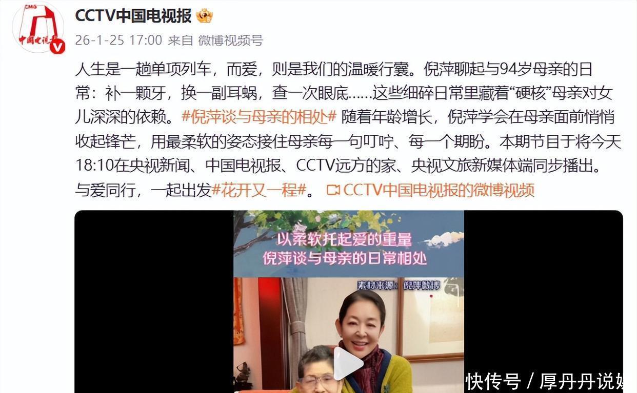 东谈主生是一回单项列车,而爱,则是咱们的祥和行囊。倪萍聊起与94岁母亲的正常:补一颗牙,换一副耳蜗,查一次眼底……这些细碎正常里藏着“硬核”母亲对儿子深深的依赖。#倪萍谈与母亲的相处# 跟着年齿增长,倪萍学会在母亲眼前暗暗收起矛头,用最柔嫩的姿态接住母亲每一句交代、每一个期盼。本期节目于将今天18:10在央视新闻、中国电视报、CCTV远处的家、央视文旅新媒体端同步播出。与爱同业,一谈登程#花开又一程