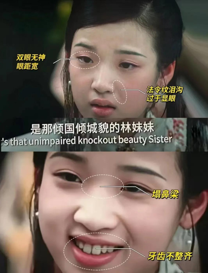荧幕中的她,眼睛眯成了一条、塌鼻梁、厚嘴唇,让东说念主直呼“辣眼睛”。