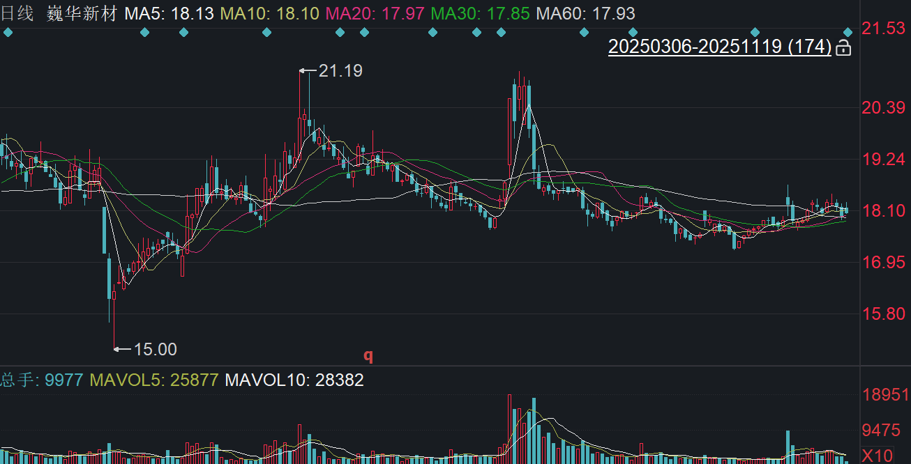 二级市集上,截止11月19日10点,巍华新材飞腾0.22%报18元/股,总市值约62.16亿元,本年来公司股价近乎“兢兢业业”。