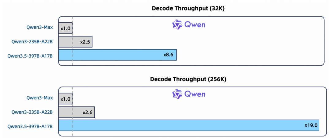 同期,千问3.5通过磨砺巩固优化以及多token臆测等系列时候,Qwen3.5性能与Qwen3-Max模子合手平,并进一步栽培了推理效劳:在常用的32K凹凸文场景中,千问3.5推理朦拢量可栽培8.6倍;在256K超长凹凸文情况下,Qwen3.5推理朦拢量最大栽培至19倍,推理效劳大幅栽培。