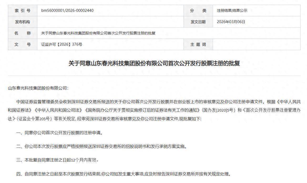 智通财经APP获悉,3月6日,证监会发布《对于应允山东春光科技集团股份有限公司初度公开刊行股票注册的批复》。据悉,春光集团拟在深交所创业板上市,中金公司为其保荐机构,拟募资7.5071亿元。 据招股书...