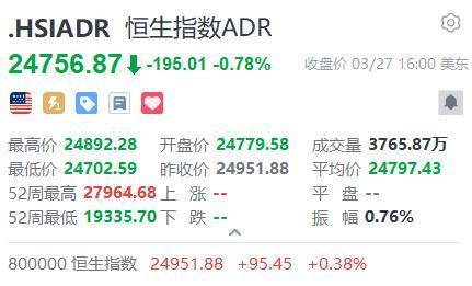 智通财经APP获悉,周五,好意思股三大指数集体收跌。恒生指数ADR下落,按比例盘算,收报24756.87点,较香港收市跌195.01点或0.78%。