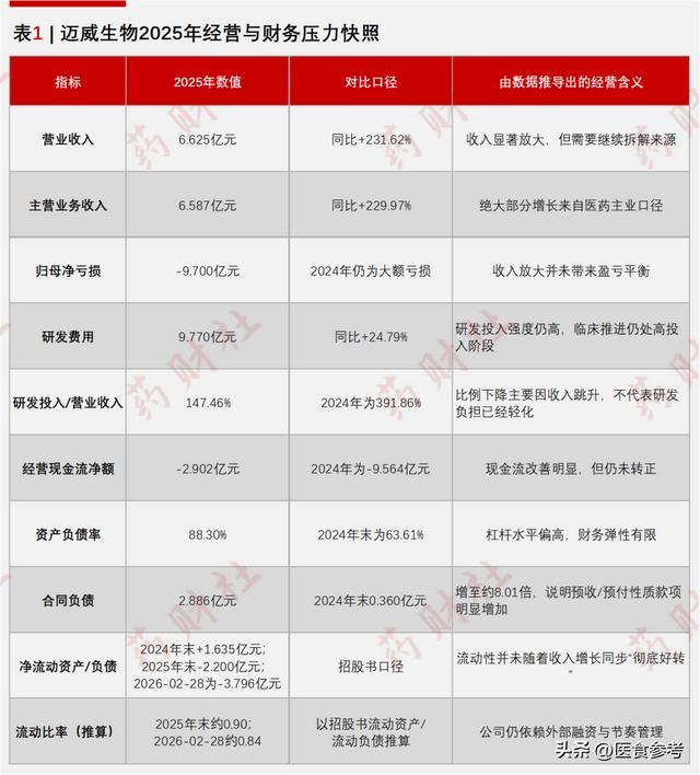 近日,尚在冲刺IPO的迈威生物亮出了2025年功绩敷陈,这份收成单看上去如实很亮眼:营业收入达到6.63亿元,同比增长了231.62%。 与此同期,迈威生物又第三次向港交所递交上市苦求,这让商场很容易将其衔接成为一家进入“爆发期”的翻新药企业。 但如若把报表阻隔看,迈威生物的这份高增长,更像一次阶段性缔造,而并非将谋略时势透顶跑通。 年报夸耀,公司在2025年归母净利润蚀本达9.69亿元,谋略手脚所产生的现款流量净额为-2.90亿元,而研发插足占营业收入的比例仍高达147.46%。 这意味着公...